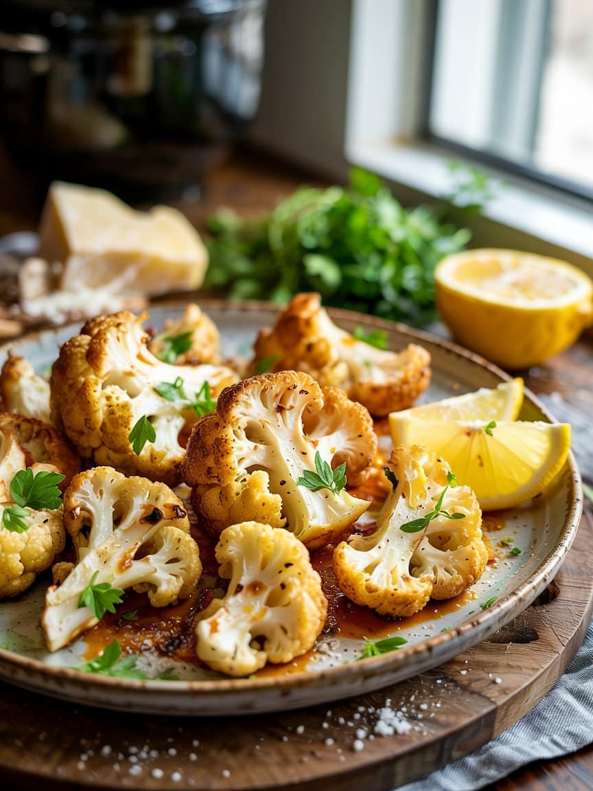 Marinate florets in a mixture of yogurt, 1 tbsp lemon juice, 1 tsp garam masala, ½ tsp turmeric, 1 tsp smoked paprika, and salt. Air-fry 12–15 minutes. Garnish with cilantro and squeeze of lemon.