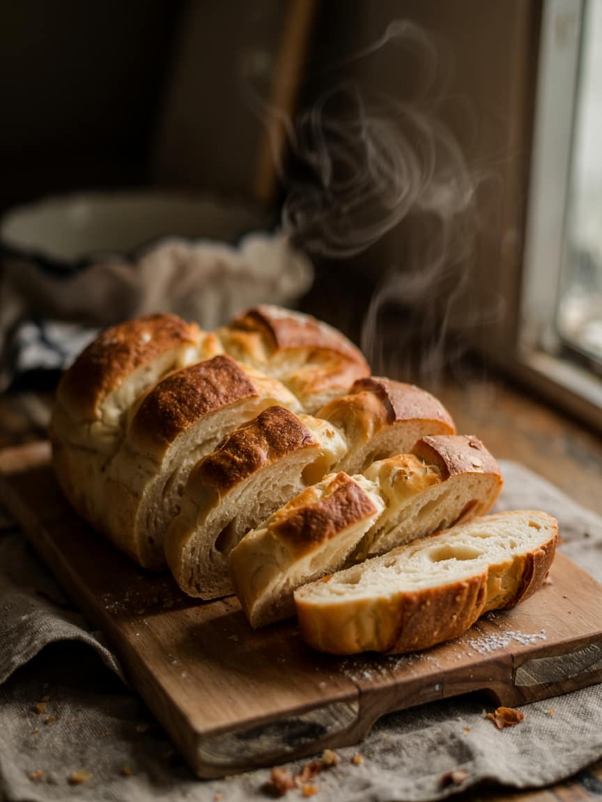 For presentation, slice with a serrated bread knife and arrange on a wooden board. Fresh herbs or a smear of compound butter elevate a simple loaf into a special dish.