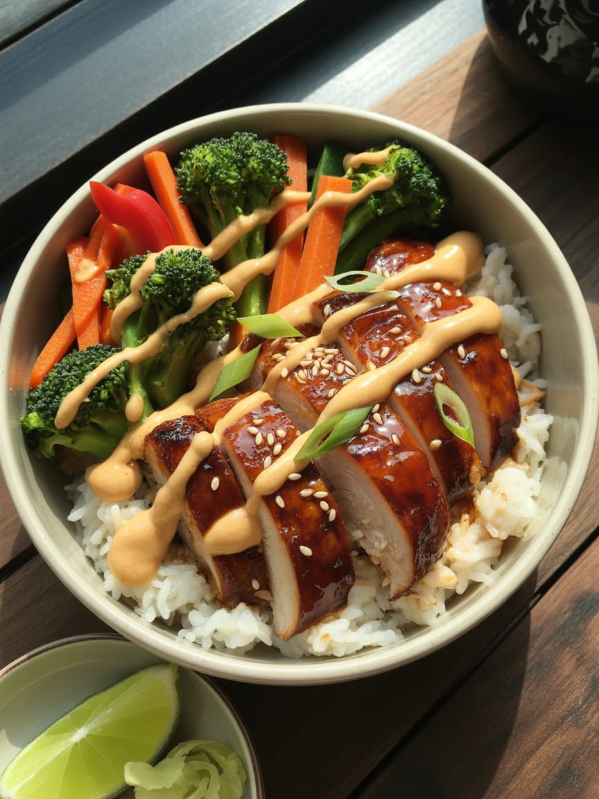 - Assemble Bowls: Divide rice among four bowls. Top with glazed chicken, arrange vegetables, and garnish with green onions, sesame seeds, cilantro, and lime wedges.