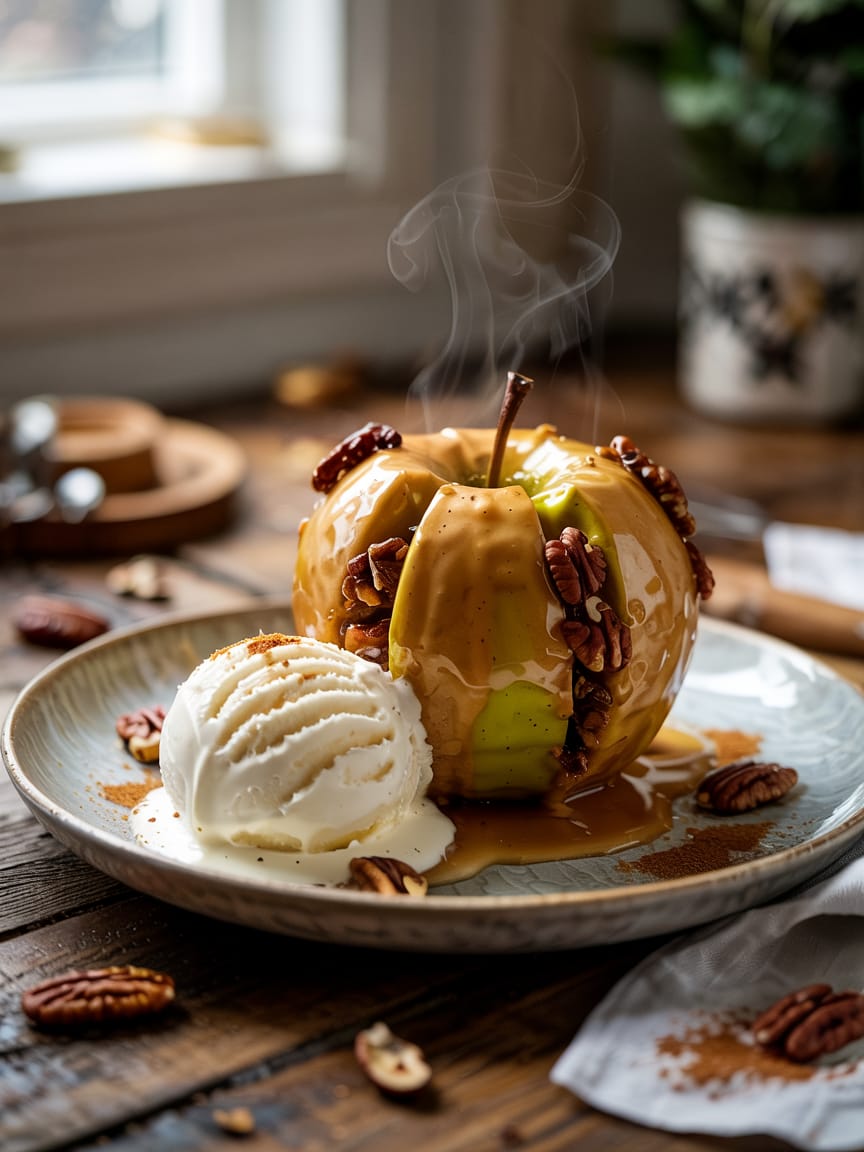 - Plate each apple, spooning some reduced pan syrup around the base. Serve warm with a scoop of vanilla ice cream, whipped cream, or a drizzle of salted caramel. Garnish with extra toasted nuts and a light dusting of cinnamon if desired.
