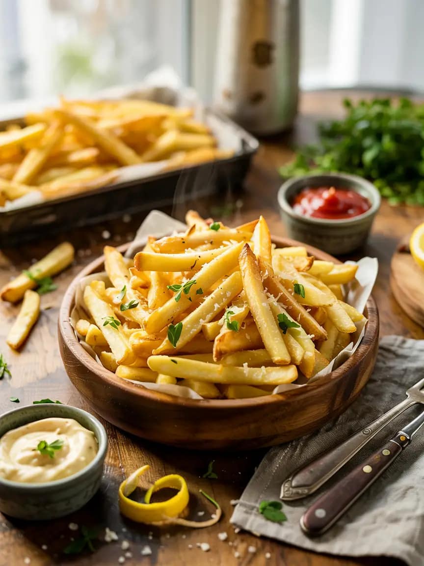 Baking fries gives you the best of both worlds: less oil than deep-frying, and the chance to coax out crispness with a few chef tricks. Parmesan brings an umami-rich, slightly nutty crunch when it browns. Garlic (fresh or powdered, used correctly) contributes aromatic bite without burning. Together they create a flavor profile that’s familiar and irresistible—think of each fry as a crunchy, garlicky, cheesy baton that’s perfect for dipping.