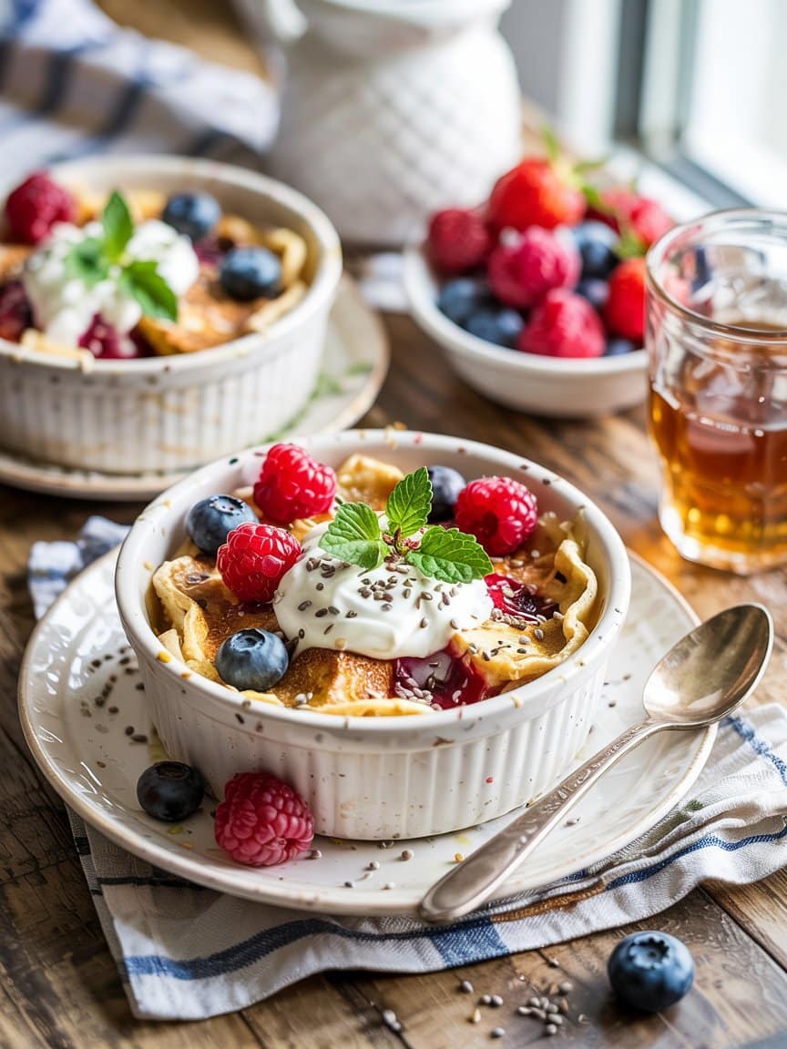 - Layering: Spoon a layer of Greek yogurt into the bottom of the ramekin, add the baked pancake, then top — this creates a parfait-like experience.