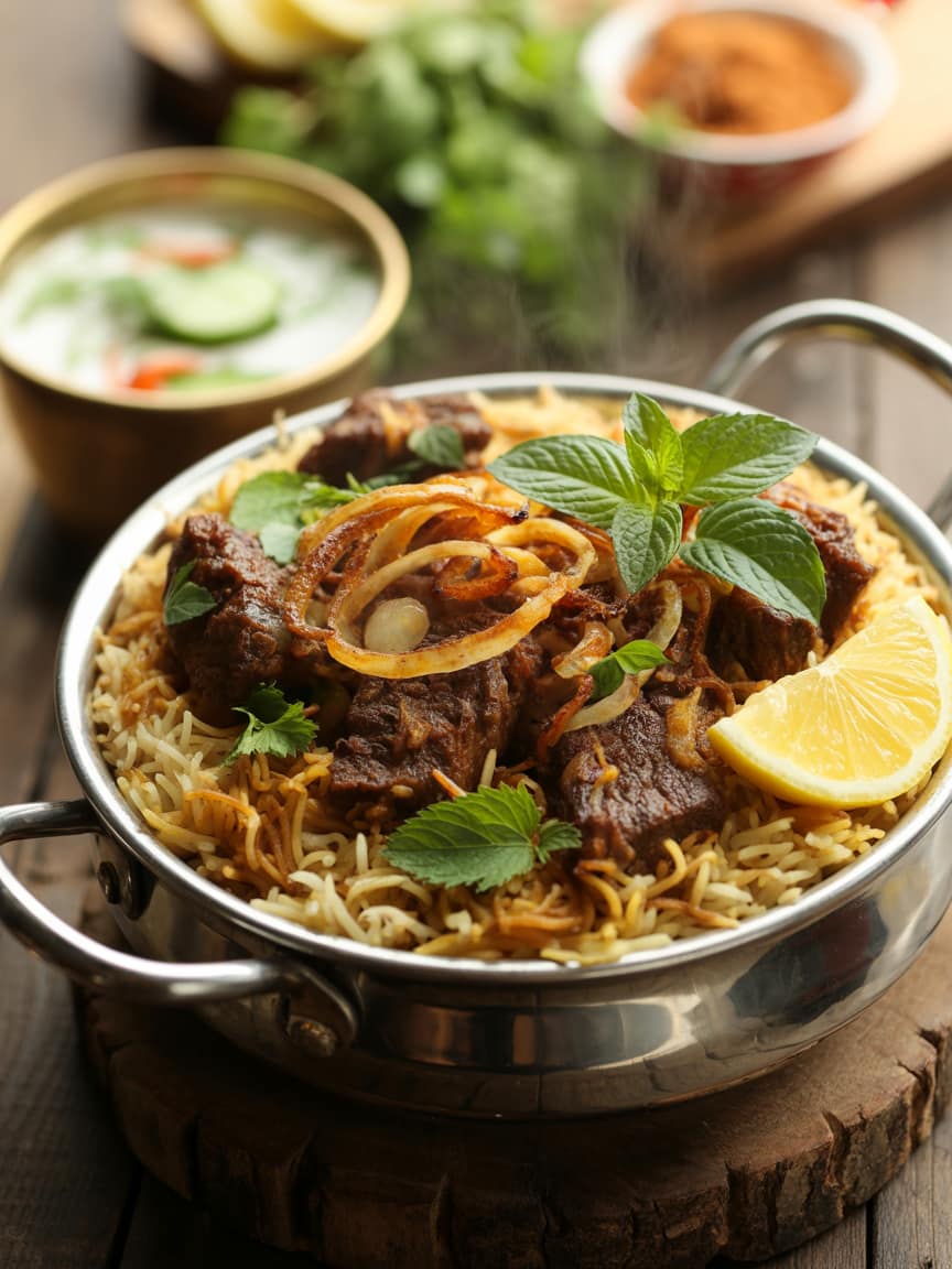 - Hyderabadi-Style Beef Biryani: Use green masala paste (fresh spices, chilies, coconut) and layer raw beef with rice for a “kachchi” style.