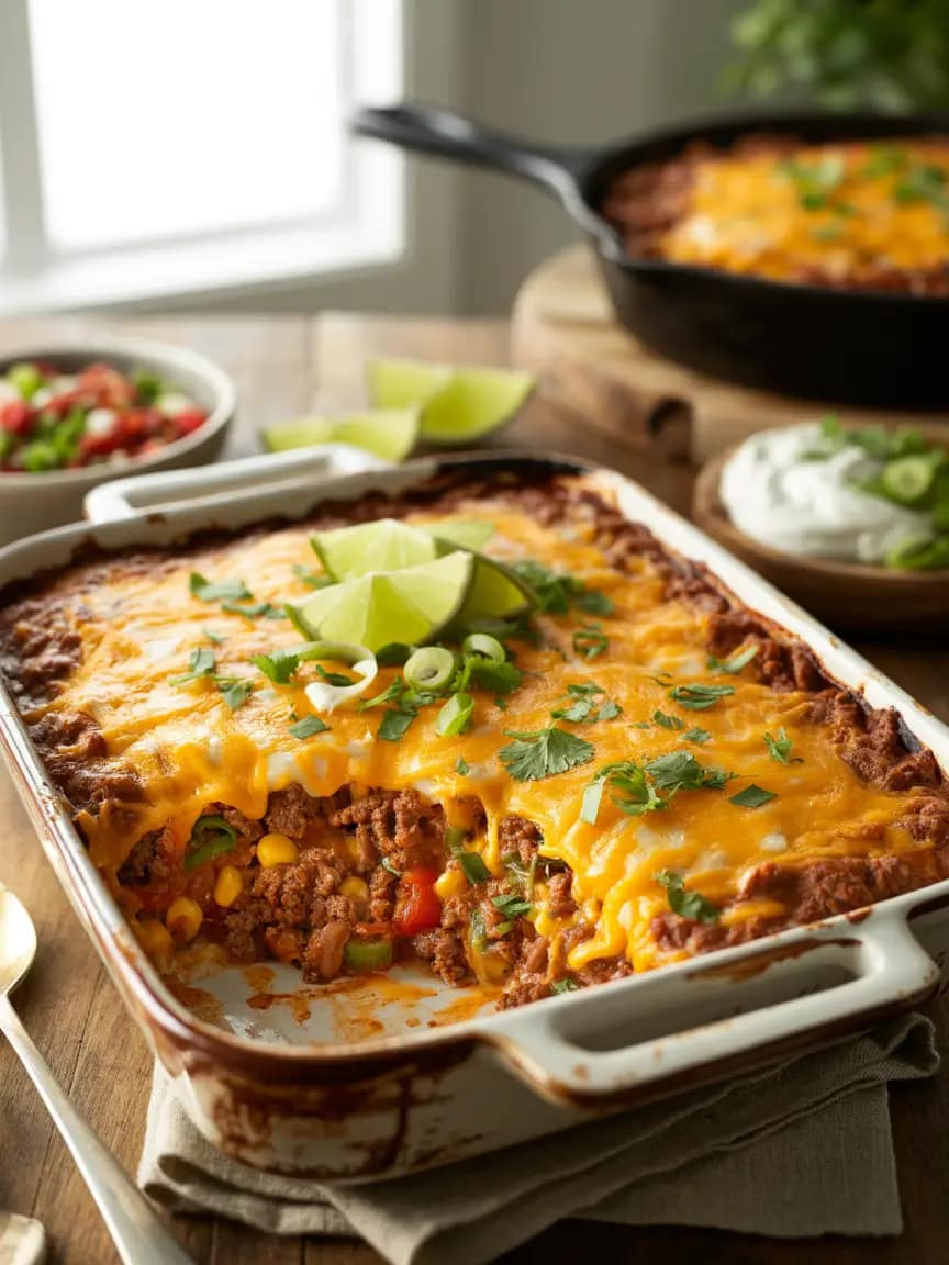 Remove from oven and let rest 10 minutes — this helps the casserole set for cleaner slices. Garnish with chopped cilantro, sliced green onions, sour cream, diced tomatoes, and lime wedges. Serve with rice, beans, or chips.