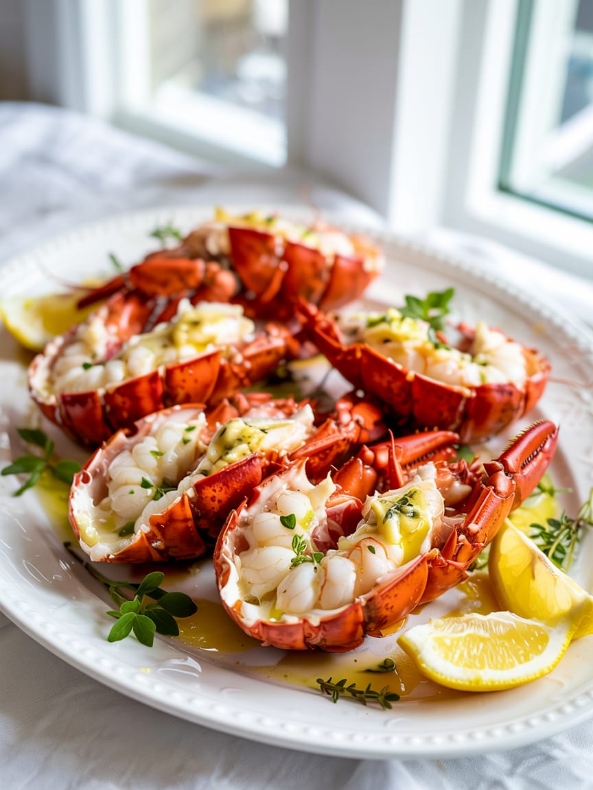 - Rest & Finish: Transfer tails to a warm platter; tent with foil and rest 3–4 minutes. Spoon a bit of poaching butter over each tail, then season with sea salt, pepper, chopped parsley, and a squeeze of lemon juice.