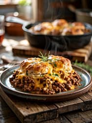Cattle Drive Casserole is a hearty baked dish that usually combines seasoned ground beef, creamy layers, cheese, and a biscuit-style or savory topping. It is the kind of recipe that feels rooted in classic American comfort food: filling enough for ranch hands, simple enough for weeknight cooking, and satisfying enough to feed a hungry family.