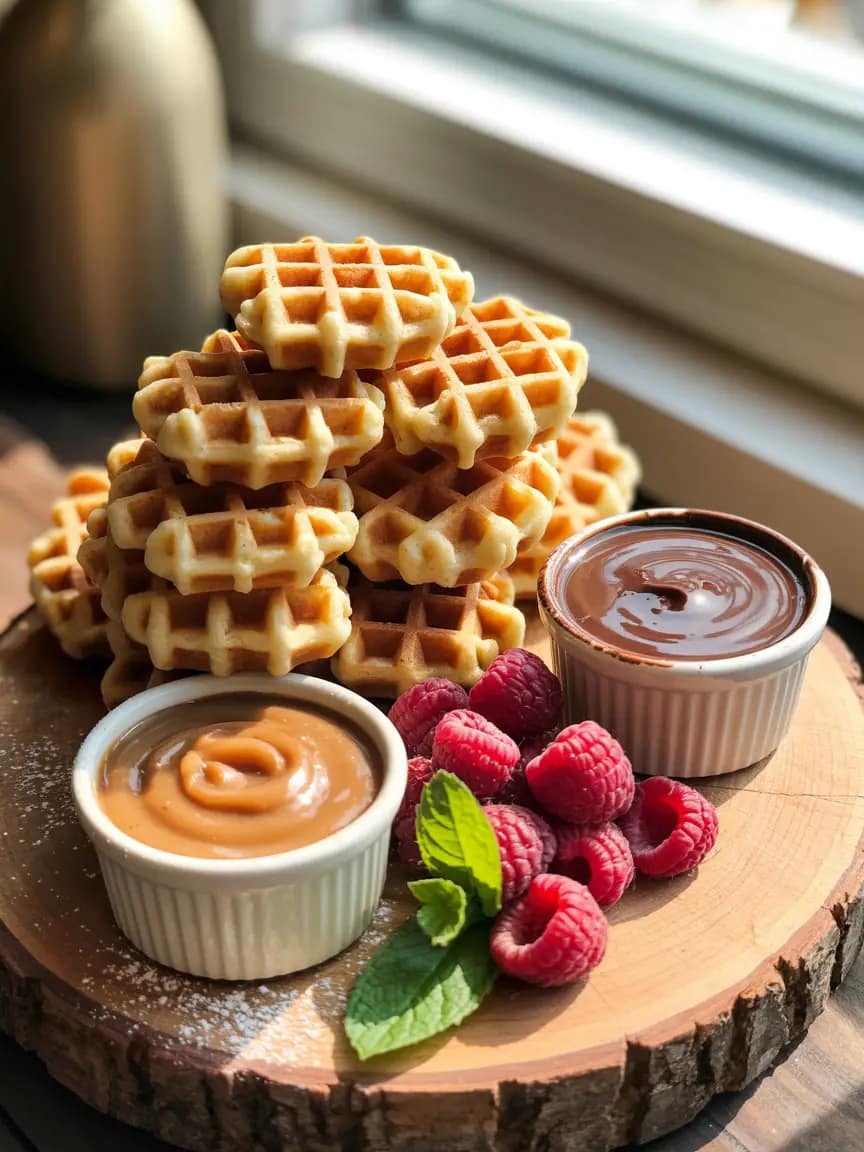 - Party platter: Arrange churro waffle bites in a pyramid on a large board with small bowls of chocolate ganache, dulce de leche, and berry compote. Garnish with fresh mint.