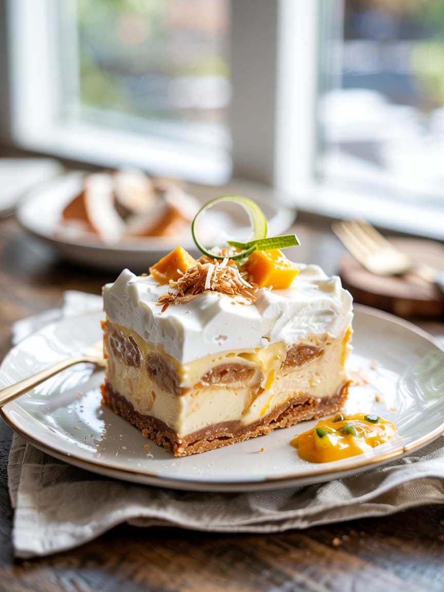 Whether you choose the silky cornstarch custard for a lighter mouthfeel or the gelatin set for perfect party-ready slices, the basic framework is forgiving and flexible. Play with fruit accents, swap the crust for crunchy macadamia crumbs, or fold in toasted coconut for extra texture. Serve it at brunch, bring it to a summer barbecue, or finish a dinner party with a plate that tastes like sunshine.
