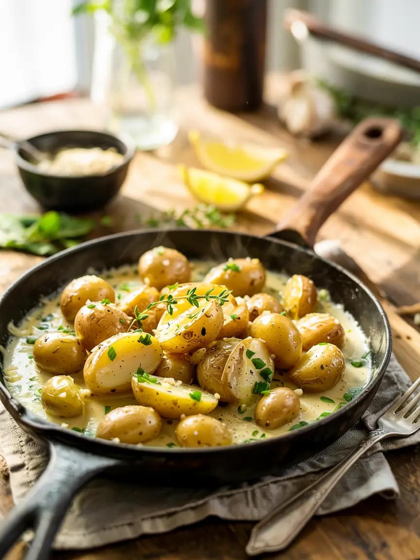 - While potatoes roast, make the garlic cream sauce: melt butter in a skillet, sauté garlic 1–2 minutes, add stock and reduce, then stir in cream and simmer until slightly thickened (4–6 minutes). Finish with lemon, herbs, and Parmesan.