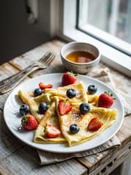 - Layered crepe cake: Stack crepes with thin layers of pastry cream, whipped cream, or jam for an elegant crepe cake (mille crepes). Chill before slicing.