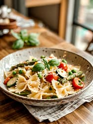 - Suggested alt text for main image: Top view of Delicious Pasta Primavera Recipe with farfalle, asparagus, cherry tomatoes, basil, and grated Parmesan.