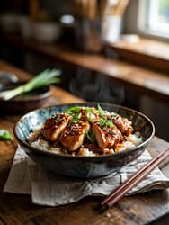 - Classic: Shredded teriyaki chicken over steamed jasmine rice, topped with sliced green onions and sesame seeds. Add steamed broccoli or a medley of snap peas and carrots.