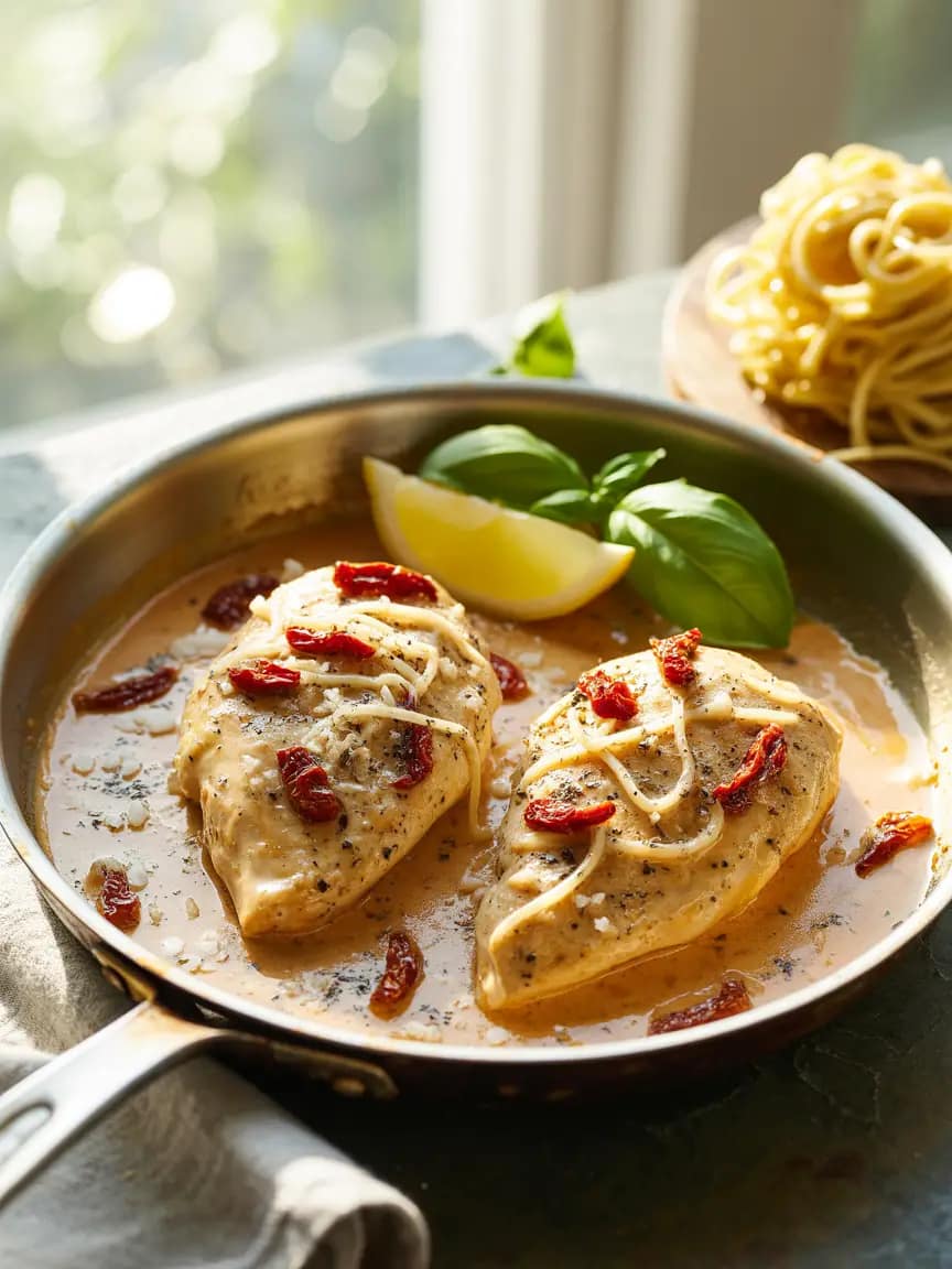 Bone-in chicken thighs (skin removed) can be used but will need longer cooking; finish in a 400°F oven for 10–15 minutes after searing. For seafood lovers: seared large shrimp or scallops work beautifully—cook until just opaque, reduce the sauce less, and finish quickly.