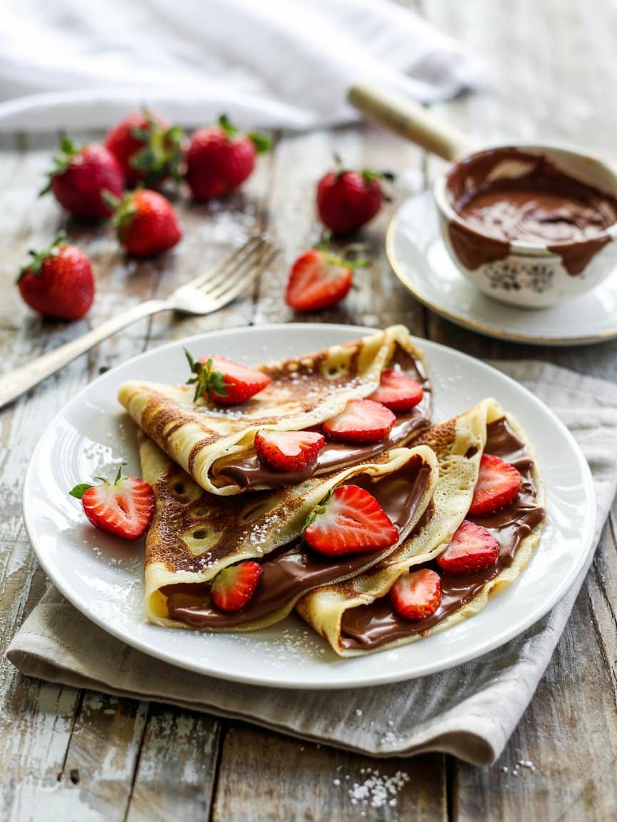- Spread a thin layer of chocolate on each crepe, add sliced strawberries, and fold or roll gently.