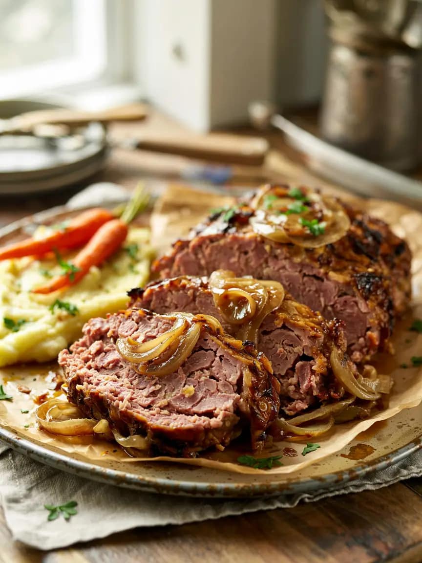 A beautiful presentation elevates a humble meatloaf into a dish that feels like a special dinner. Remember: texture contrast — creamy mash, crisped loaf edges, silky onions — is what makes every bite interesting.