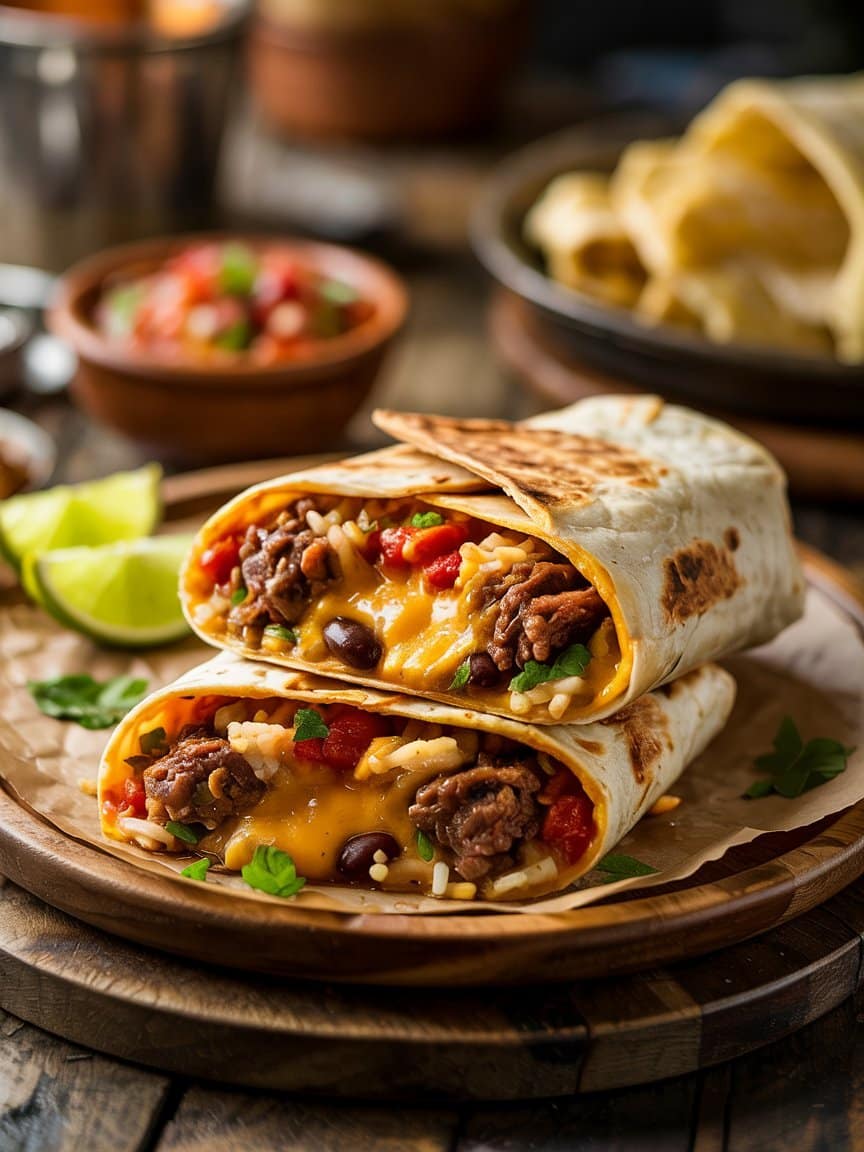 - Let the burrito rest 1–2 minutes (cheese is molten and piping hot). Slice in half on the diagonal to show ooey-gooey cheese. Serve with lime wedges, salsa, or extra sauce.