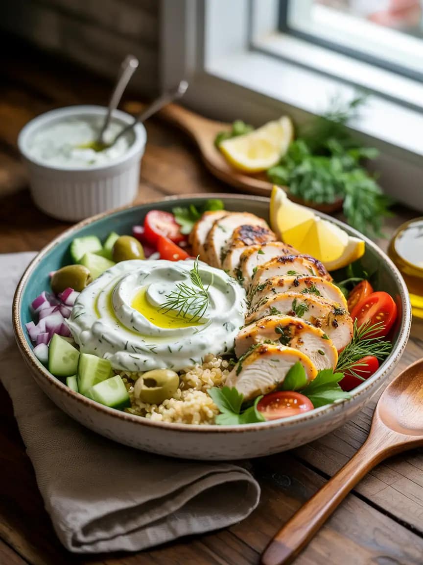 - Variations: swap chicken for falafel (vegetarian), shrimp or salmon (seafood), or omit grains for a low-carb option. For dairy-free tzatziki, use strained coconut or cashew yogurt and add avocado for creaminess.