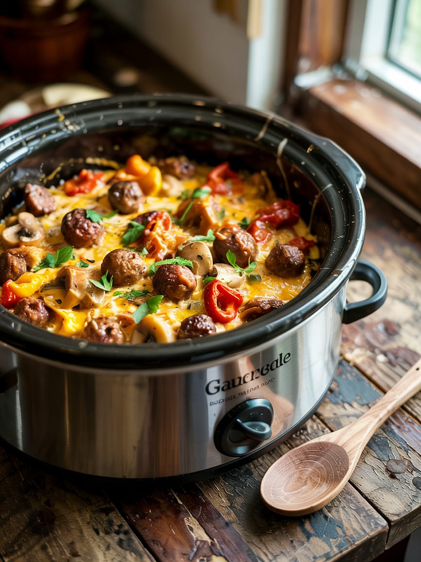 - Savory sausage, sautéed veggies, and creamy cheese blend beautifully.