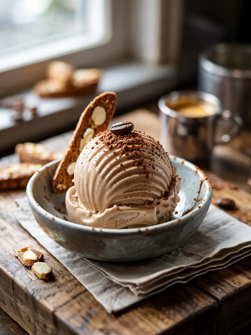 - Serve: Serve slightly warmer than ice cream to release the coffee aroma — scoop into chilled bowls, garnish as desired, or use in an affogato (hot espresso poured over a scoop).
