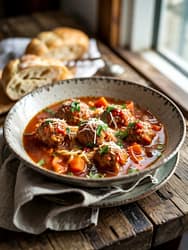 This soup balances textures and flavours: meaty, herby meatballs; a light, aromatic tomato-and-broth base; al dente tiny pasta; and bright greens for freshness. The secret techniques — soaking breadcrumbs in milk, gentle mixing of the meat, briefly browning the meatballs, and layering ingredients by cook time — produce tender meatballs that keep their shape and a broth that’s flavourful but not overly heavy.