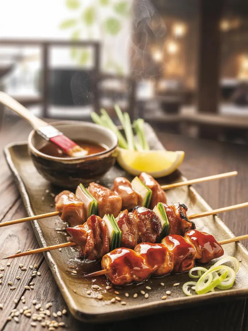 - Arrange skewers on a long platter. Garnish with sliced scallions, a dusting of shichimi togarashi or sesame seeds, and lemon/yuzu wedges. Offer a small bowl of warm, previously boiled (see Notes) tare for dipping.