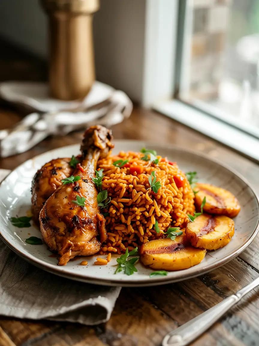 - Plate & Serve — Fluff rice gently with a fork. Arrange roasted or seared chicken over or beside the rice. Spoon any chicken juices onto the dish. Garnish with chopped parsley or scallions and serve with fried plantains or a crisp salad if desired.