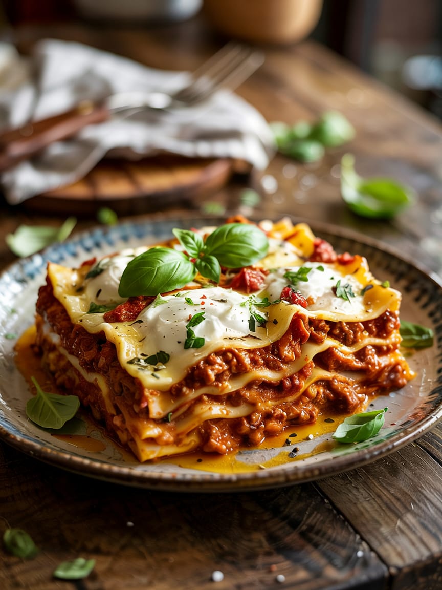 - Plating: Plate one lasagna square centered, garnish with fresh basil leaves, and drizzle with a bit of extra-virgin olive oil or aged balsamic.