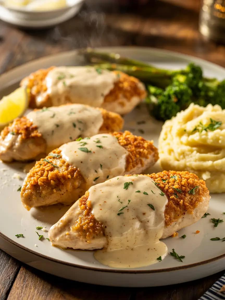 Calories, fat, and sodium will vary with portion size, breading thickness, and amount of sauce. The heavy cream and cheese make this a richer dish — consider lighter sauce options (half-and-half, stock-based reduction) if you’re watching calories.