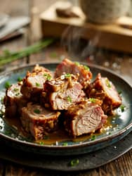 - Vacuum-seal belly cubes with a pinch of salt and herbs. Sous-vide at 68°C (155°F) for 6–10 hours (longer cooks render more fat). Chill briefly, pat dry, dust with starch, and flash-fry or sear at high heat to crisp. Finish with maple-mustard glaze.