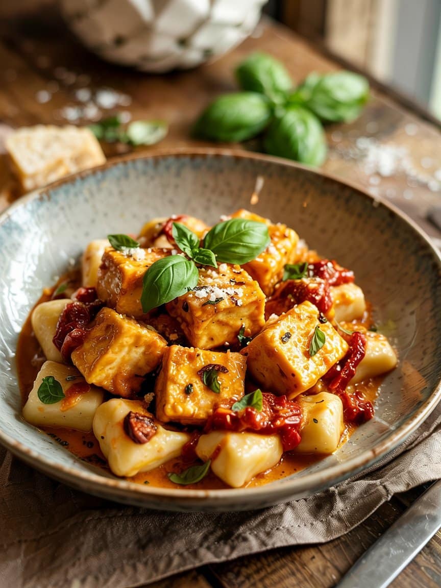 The original “marry me” concept hinges on a luscious sauce built from caramelized aromatics, sun-dried tomatoes, cream, and a big hit of Parmesan and herbs. For this vegetarian twist, crispy tofu brings concentrated savory crunch to balance the sauce’s silkiness; gnocchi soaks up the flavor and adds chew and comfort. Texture contrast is the star: silky sauce, crispy edges, pillowy dumplings. The bold umami from sun-dried tomatoes and optional miso or soy sauce ensures this feels satisfyingly savory even without meat.
