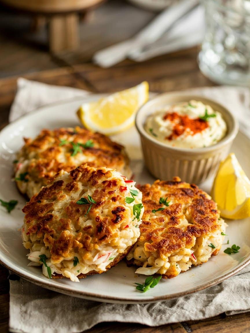 - Sauces & serving suggestions: Try with remoulade (mayo + mustard + capers + pickles + lemon), lemon aioli (mayo + lemon zest/juice + garlic), or simple melted butter with a sprinkle of seasoning. Serve with a crisp salad, coleslaw, fries or roasted potatoes, or on a soft bun as a crab cake sandwich.