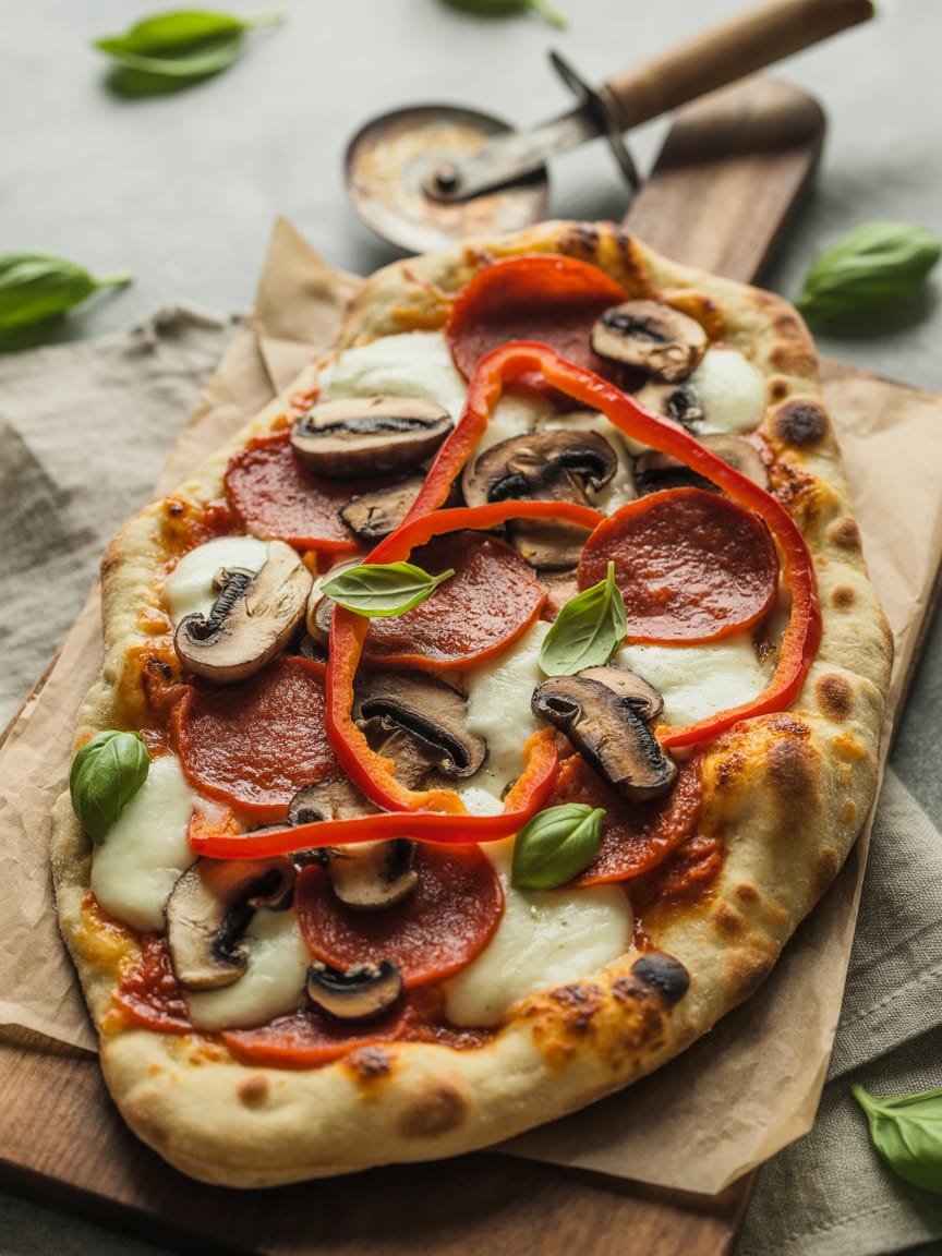 - Toppings of choice e.g., pepperoni, mushrooms, bell peppers, spinach, cooked chicken