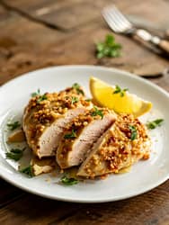 Nutrition will vary based on portion size, crust composition, and whether you use butter or oil. Roughly, one medium Parmesan-crusted chicken breast (no sides) might be around 350–500 kcal. This dish contains dairy (Parmesan, milk/egg wash) and gluten (breadcrumbs/flour) unless substituted.