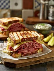 - Reuben: Corned beef, Swiss, sauerkraut, Russian dressing, rye.