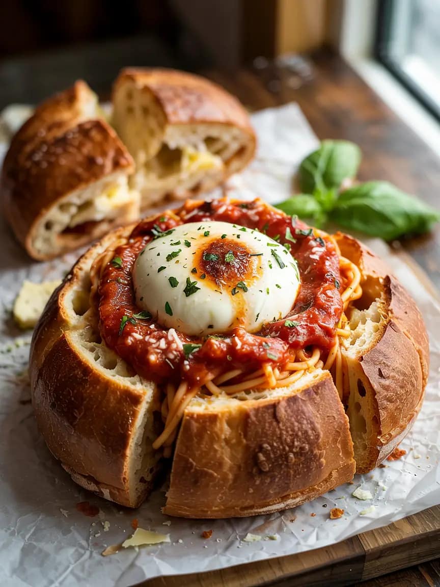 This recipe marries two crowd-pleasers: garlic bread and spaghetti. The bread bowl is both vessel and flavor-delivery system — its crust stands up to saucy spaghetti while the interior soaks up flavors. Serve it on a platter for sharing, or portion smaller bowls for individual comfort servings. It’s tactile, theatrical, and deliciously satisfying.