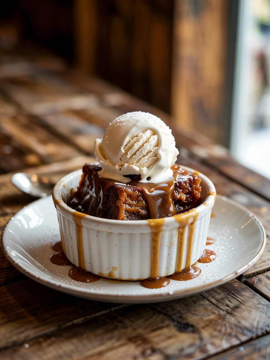 - Traditional: A generous scoop of vanilla bean ice cream balances the rich toffee sauce.