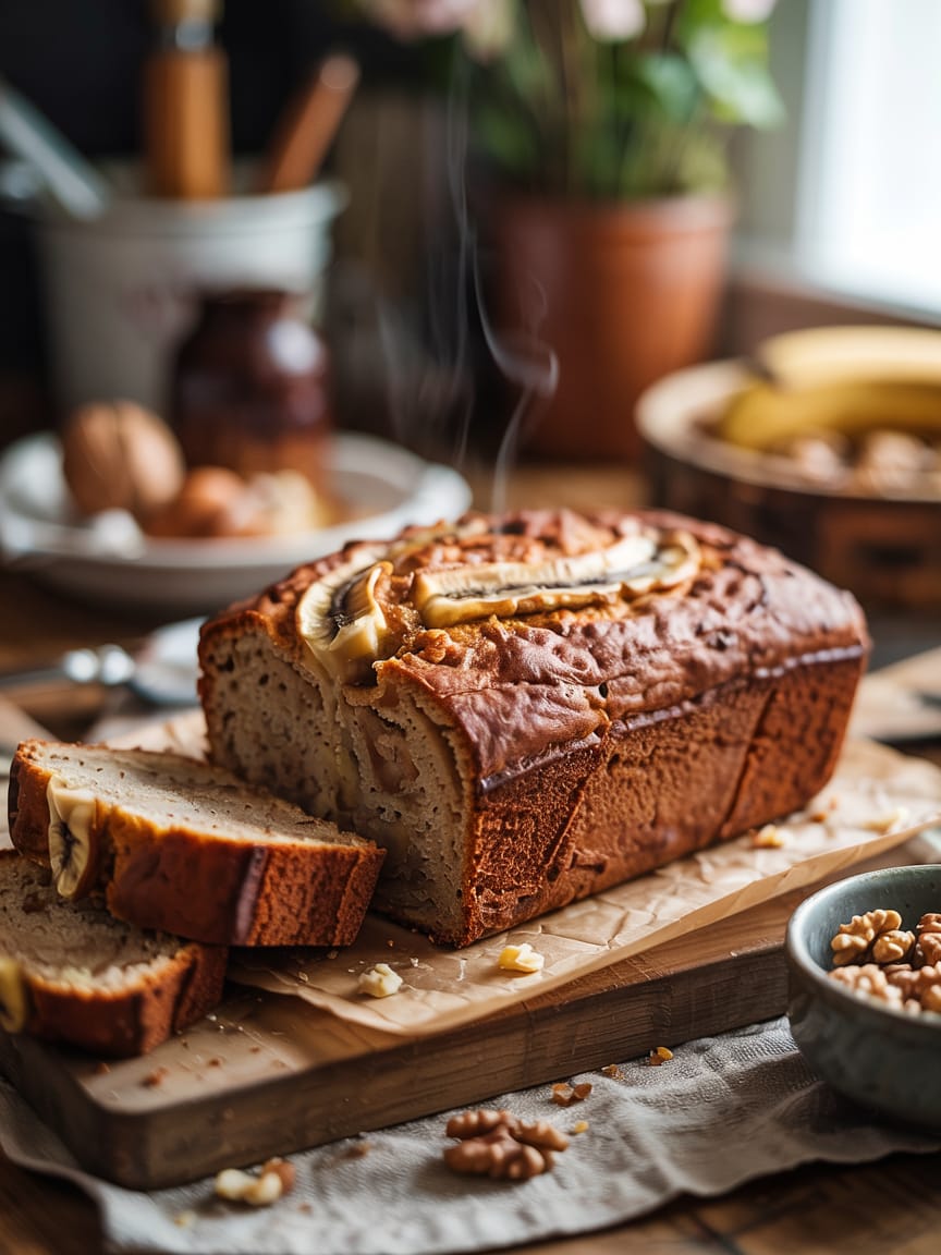 Spoon batter into prepared loaf pan. Smooth the top lightly and, if you like, press a few extra banana slices, nuts, or chocolate chips on top for a bakery look.