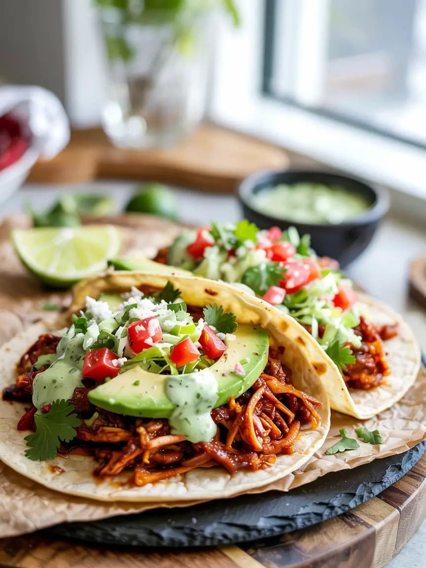 - Layer: tortilla → protein → pico de gallo → slaw → creamy cilantro-lime sauce → avocado → cheese → squeeze of lime.