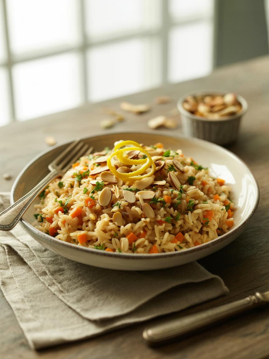 Method: Sauté onion & carrots in butter+oil until soft → add garlic → add rice and toast 2–4 minutes → add stock & spices, bring to simmer → cover and cook low 15–18 min → rest 10 min → fluff, stir in toasted nuts & herbs, finish with lemon zest.