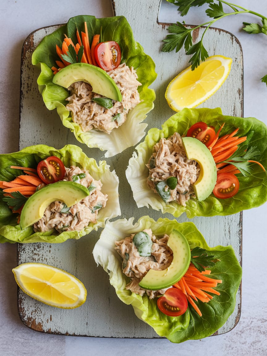 Lay out 2–3 lettuce leaves per serving. Spoon a generous amount of tuna salad into the center of each leaf. Top with avocado slices, halved cherry tomatoes, or shredded carrots if desired.