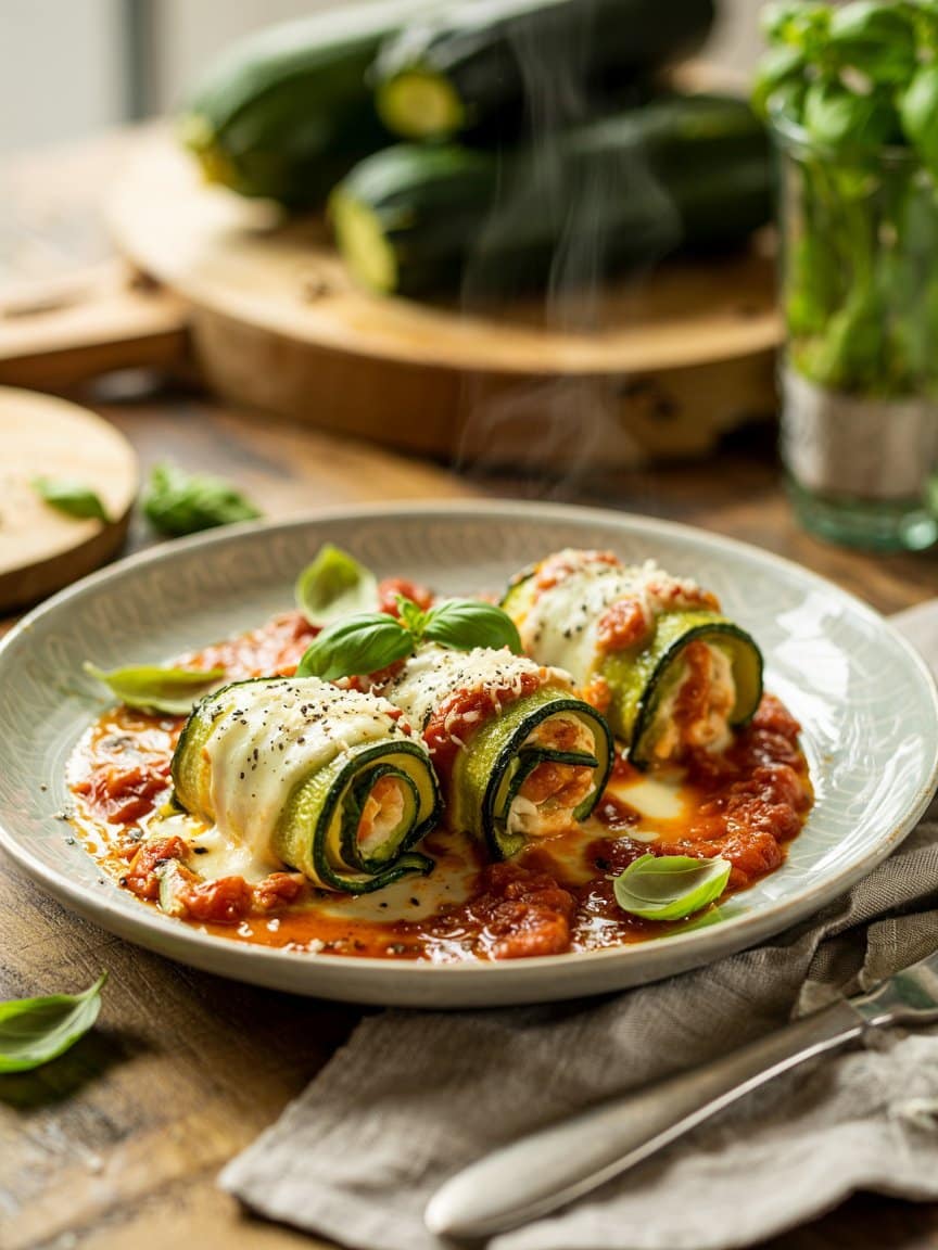 While I won’t give exact calories (they vary based on cheese brands and quantities), a typical serving of zucchini rollatini is lighter than a pasta-based casserole. Using part-skim ricotta and reduced-fat mozzarella trims calories; using full-fat cheeses increases richness and satiety. To make this dairy-free, use the vegan cashew–tofu filling and omit cheese, or use plant-based cheeses.
