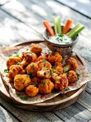 Sauce the wings: Remove cauliflower from oven and toss in the warm buffalo sauce to coat thoroughly.