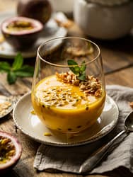 - Optional garnish: reserved passion fruit seeds fresh fruit slices, mint leaves, toasted coconut, chocolate curls, etc.